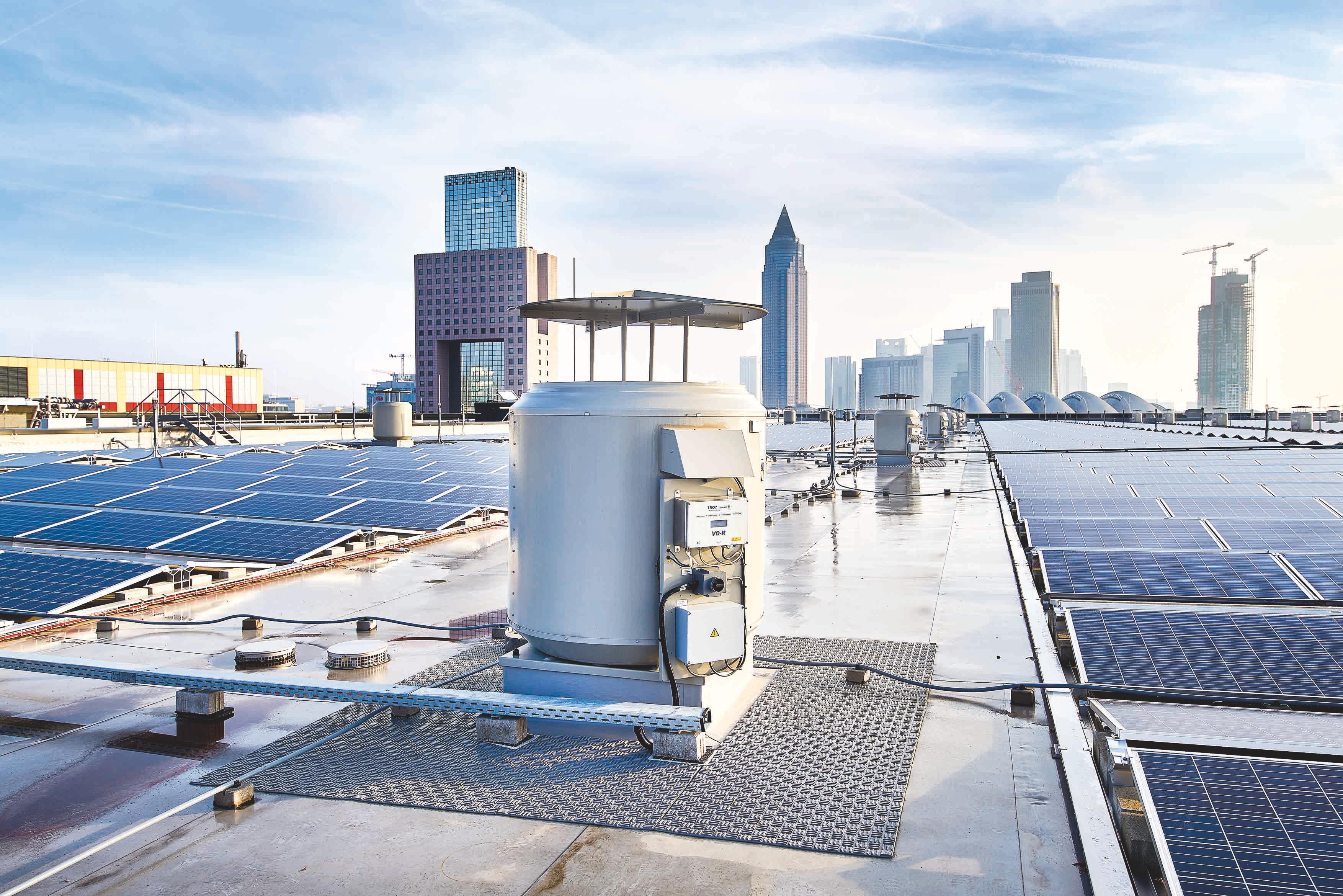 On the roof of exhibition hall 12: TROX X-FANS BVD roof smoke extract fans are equipped with the intelligent fan diagnostics system.
